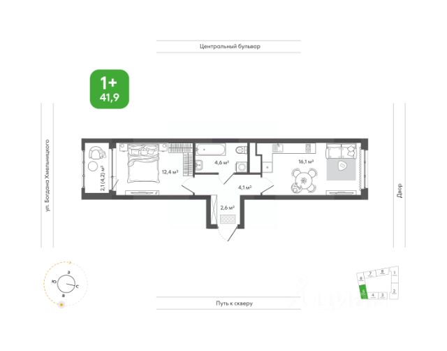 Отличная планировка, комната- 21,5 кв. м. удобная для комфортного расположения мебели, просторная и современная кухня -9,3 кв. м.
