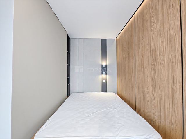 Спальная зона оформлена мягкой стеновой панелью. Это звукопоглощение, тактильный комфорт и атмосфера, настраивающая на отдых. Здесь нет визуального шума, только чистая геометрия и натуральные фактуры.