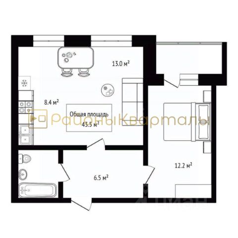 - Выделены зоны для питания работы и отдыха с дверью и окном;