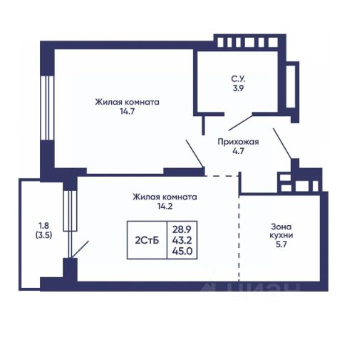 Квартира с кухней-гостиной и двумя спальнями в жилом районе "Пшеница". Особенности планировки: балкон, предчистовая отделка, разнесённые спальни.