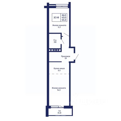 Две (2) изолированные комнаты площадью 26.0 м² и 23.3 м², просторный холл 8.2 м², прихожая 4.0 м², кухонная зона площадью 7.4 м², ванная комната 6.5 м² с возможностью размещения санузла, дополнительный санузел 2.1 м², обширная лоджия с двумя входами и прекрасным видом во двор предлагают Вам безграничные возможности для реализации любых дизайнерских решений.
