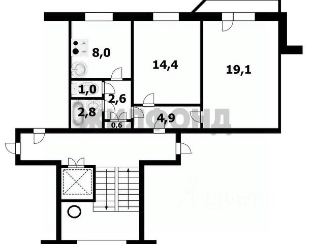 Входная дверь надёжная, на полу линолеум, сантехника и бытовая техника работают без нареканий.