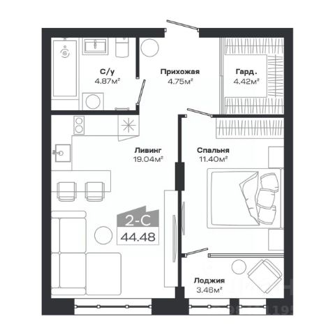 2 изолированные зоны — просторная студийная гостиная с кухонной зоной и отдельная спальня.