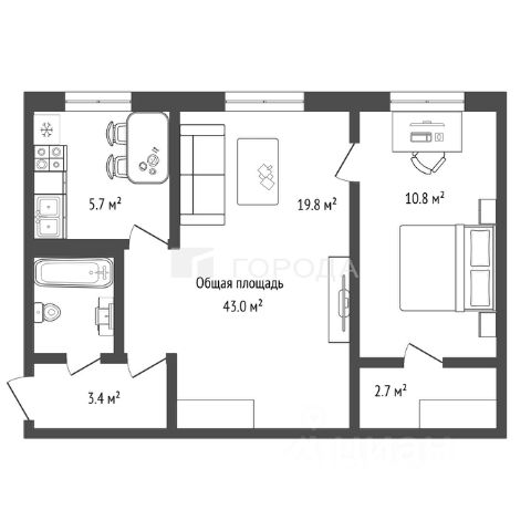 Общая площадь 61.8 м2, жилая 33.6 м2, кухня 10.2 м2
