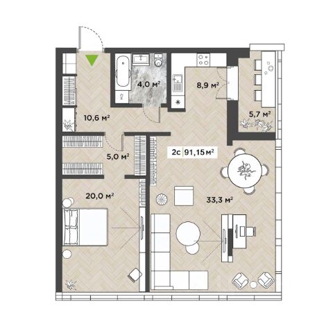 Просторная кухня-гостиная 26 кв.м. с выходом на балкон, спальня 12,5 кв.м с выходом на балкон, кабинет или детская комната (10 кв.м.) В квартире 2 с/у. Квартира полностью меблирована и готова к проживанию.