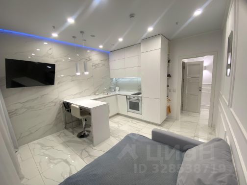 Кухня-гостиная оснащена современным кухонным гарнитурам со встроенной техникой, варочная панель и духовой шкаф, холодильник, посудомоечная машина, вытяжка, микроволновая печь, удобный диван, обеденный стол и два стула, шторы и тюль. В спальне остается кровать с комфортным матрасом, встроенный шкаф для одежды, два прикроватных столика, шторы и тюль.