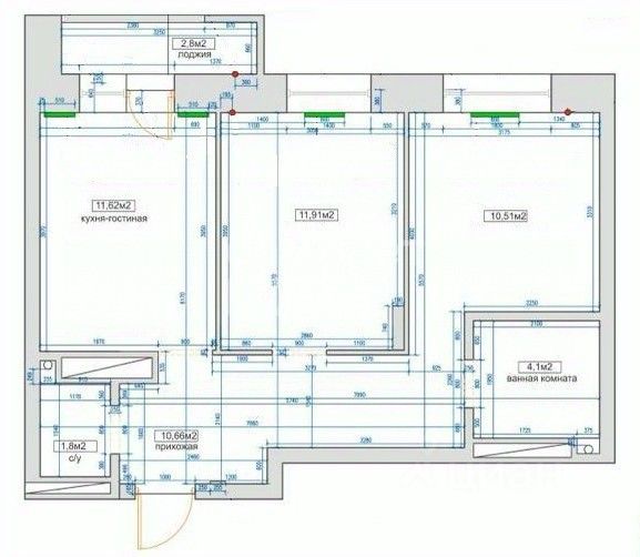 Удобная планировка, общая площадь квартиры, с учетом лоджии, 62,8 кв.м., гостиная 18,4 кв.м.; спальня 17,1 кв.м., с двумя окнами, что, в случае необходимости, позволяет сделать функциональную перепланировку; просторная кухня 11,6 кв.м.; ванная 5,1 кв.м.; холл 8,4 кв. м.; лоджия 2,2 кв.м.