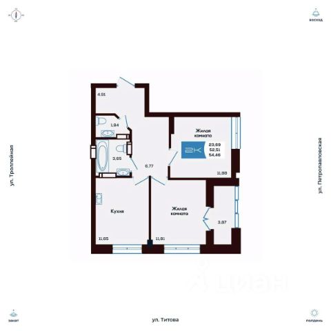 Продаётся 2-комнатная квартира в строящемся доме (Дом 2), срок сдачи: I-кв. 2027, общей площадью 54.68 кв.м., на 9 этаже. Новые жилые дома от компании "SKY GROUP" расположены в Ленинском районе Новосибирска на ул. Титова.