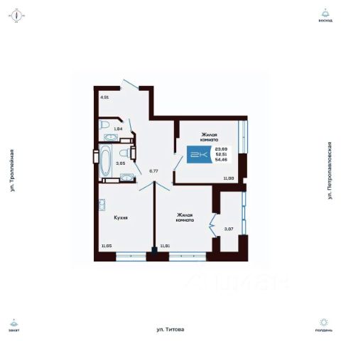 Продаётся 2-комнатная квартира в строящемся доме (Дом 2), срок сдачи: I-кв. 2027, общей площадью 54.68 кв.м., на 4 этаже. Новые жилые дома от компании "SKY GROUP" расположены в Ленинском районе Новосибирска на ул. Титова.