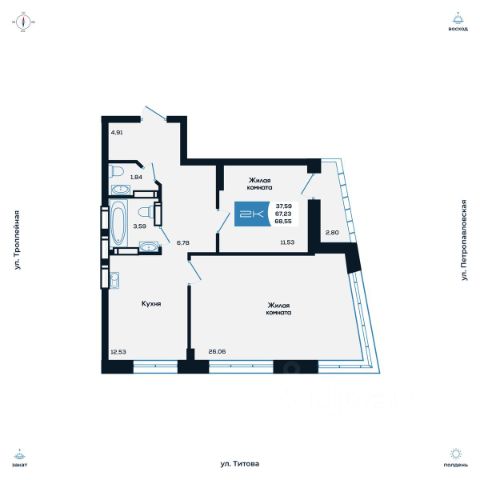 Продаётся 2-комнатная квартира в строящемся доме (Дом 2), срок сдачи: I-кв. 2027, общей площадью 66.84 кв.м., на 2 этаже. Новые жилые дома от компании "SKY GROUP" расположены в Ленинском районе Новосибирска на ул. Титова.
