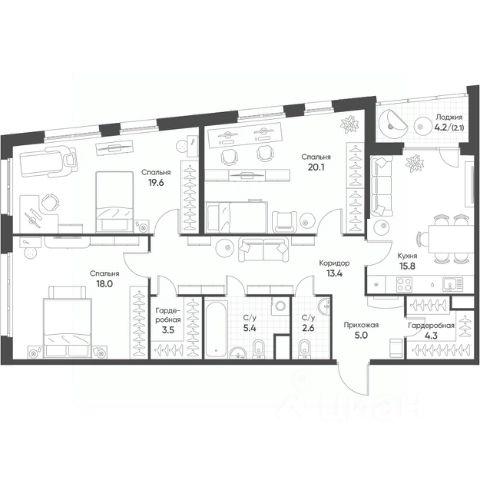 * Возможность организовать просторную кухню-гостиную и три отдельные спальни — идеальный вариант для семьи.