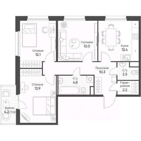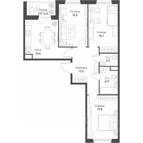 * Две лоджии: одна с выходом из кухни-гостиной, вторая — из спальни.