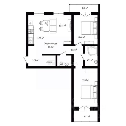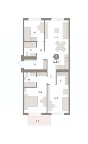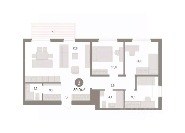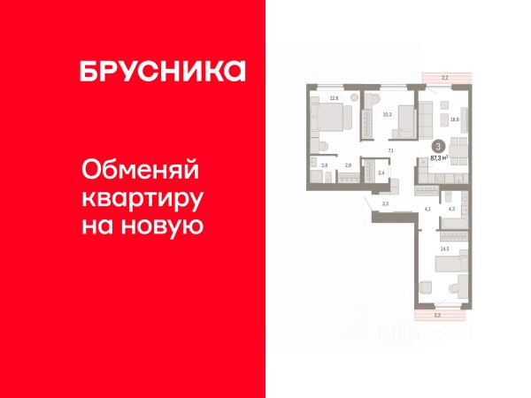 Квартира с кухней-гостиной и тремя спальнями в жилом районе "Пшеница". Особенности планировки: балкон, вид во двор, гардеробная, мастер-спальня, окна на две стороны, предчистовая отделка, разнесённые спальни.