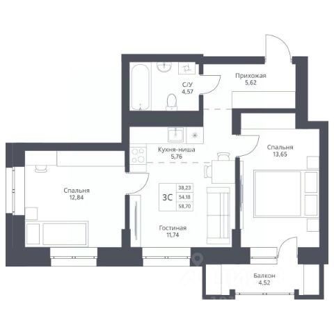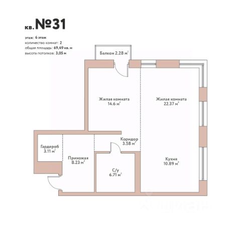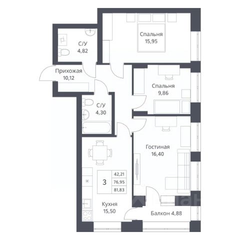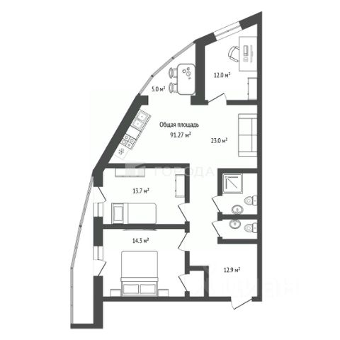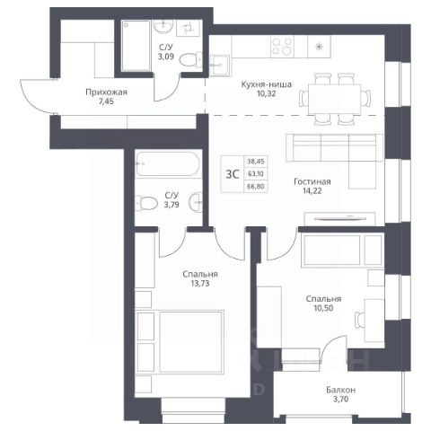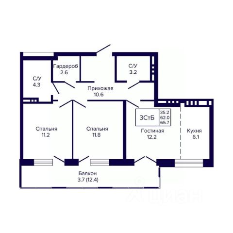 Просторная кухня-гостиная 26 кв.м. с выходом на балкон, спальня 12,5 кв.м с выходом на балкон, кабинет или детская комната (10 кв.м.) В квартире 2 с/у. Квартира полностью меблирована и готова к проживанию.