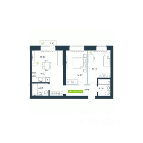 • ✅ Минимальная площадь: 57,5 м²
