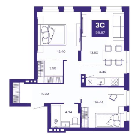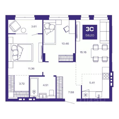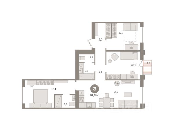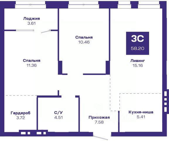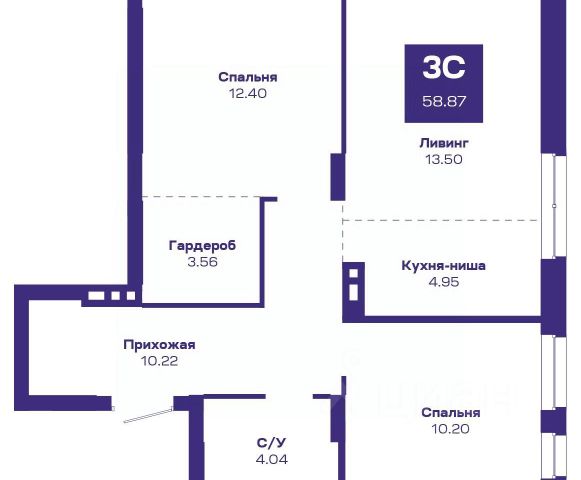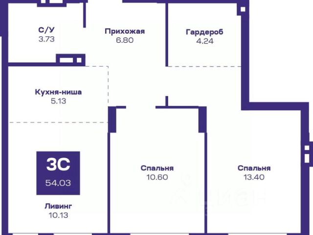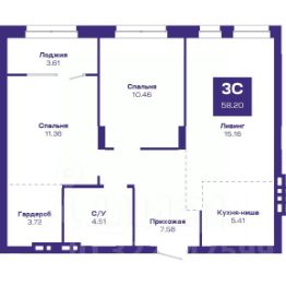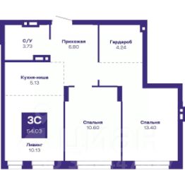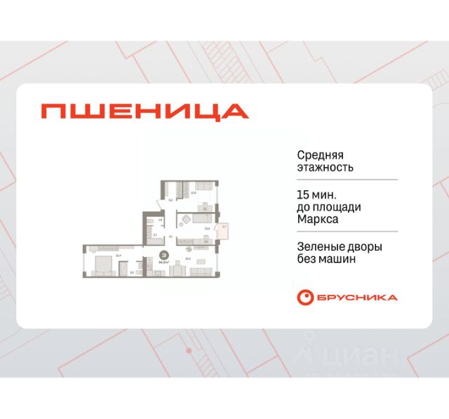Квартира с кухней-гостиной и тремя спальнями в жилом районе "Пшеница". Особенности планировки: окна на две стороны, гардеробная, разнесённые спальни, предчистовая отделка, мастер-спальня, балкон.