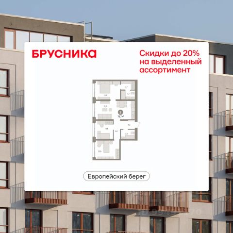 Квартира с кухней-гостиной и тремя спальнями в проекте Город-на-озере. Особенности планировки: второй санузел, гардеробная, лоджия, мастер-спальня, потолки 3 м и выше, предчистовая отделка, рабочий кабинет, разнесённые спальни.