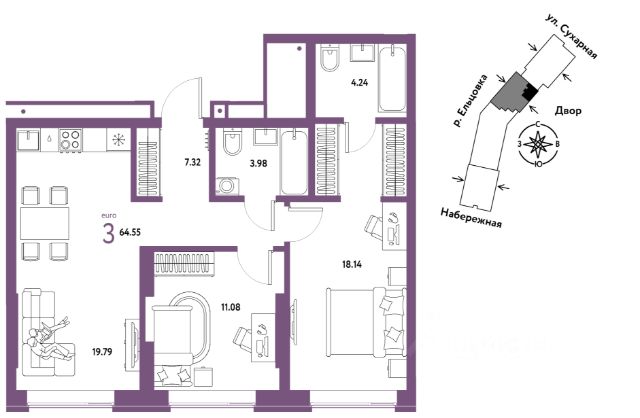 Трехкомнатная студия от застройщика с предчистовой отделкой в ЖК "Русское солнце" на 5 этаже. Общая площадь: 52.3 кв.м., жилая: 35.06 кв.м., общая площадь гостиной-столовой с кухонной зоной: 14.94 кв.м. Квартира угловая, идеально подойдет любителям тишины и панорамных видов. В квартире два балкона, один совмещенный и один раздельный санузел. Высота потолков 2.96 м.