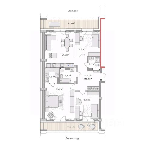 Ни одна из стен квартиры не граничит с соседями. На лестничной площадке расположены 2 квартиры.
