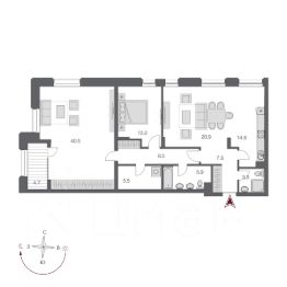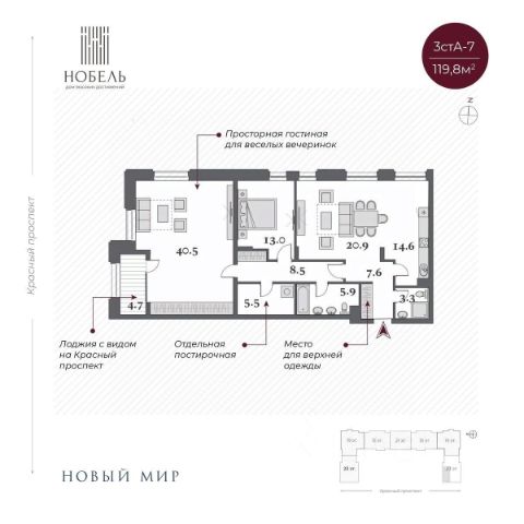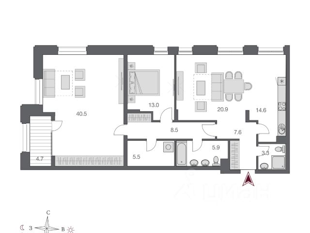Планировка: просторная кухнягостиная с зоной отдыха и обеденной группой, две изолированные спальни и возможность сделать третью полноценную спальню с гардеробной на втором уровне без потери объёма и света.