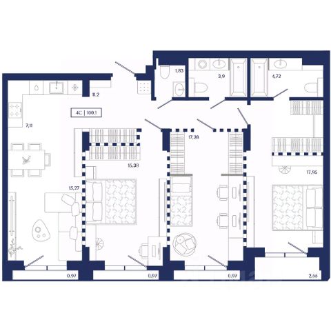 Общая площадь квартиры — 91 м², грамотная планировка для семьи: просторная кухнягостиная, три изолированные спальни, два санузла, отдельная гардеробная.