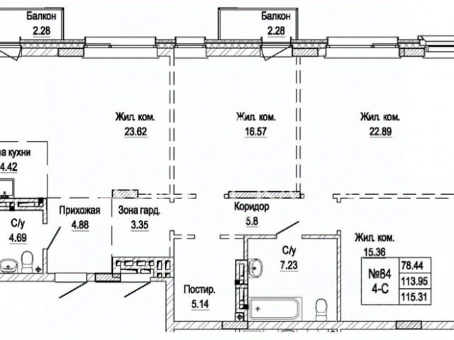 Стяжка пола подготовлена к укладке чистовых отделочных материалов (керамогранит, ПВХ-плитка, ламинат, паркет и т.д.), на кирпичные стены нанесена гипсовая штукатурка. Стены сан. узлов изнутри оштукатурены марочным цементно-песчаным раствором.