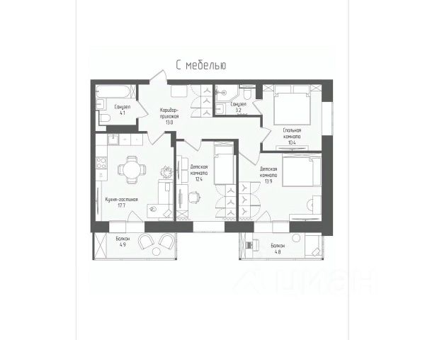 Просторная кухня-гостиная с панорамными окнами, спальня с эркером, две детские, зона рабочего кабинета, санузел с душевой и ванная. Каждая комната это личное пространство, где царит атмосфера уюта и спокойствия. Окна квартиры выходят на две стороны: во двор и на реку. Продуманная планировка обеспечивает комфорт для каждого члена семьи, а большое количество мест хранения помогает поддерживать порядок в доме.
