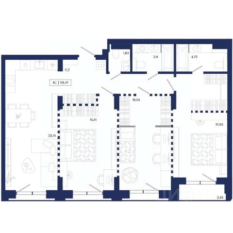 * Три спальни: 28, 26,3, 22,1 кв.м, имеется возможность организовать 4-ю спальную комнату.