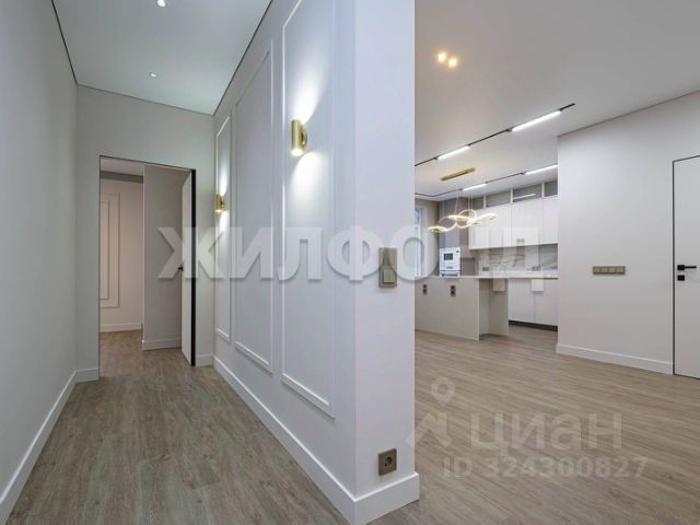Особенностью квартиры являются высокие потолки и большие, панорамные окна, которые пропускают много естественного света. Квартира состоит из просторной кухни-гостиной с выделенной обеденной зоной, спальни, детской комнаты и кабинета. Имеются гостевой санузел с душем и общий холл в зоне прихожей. Гардеробная комната. Ванная комната — установлена душевая кабина