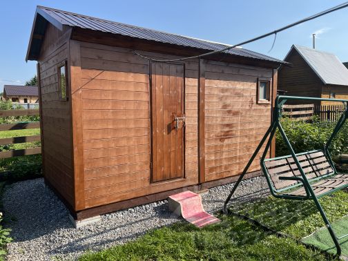 Гараж металлический на 1 автомобиль, беседка летняя площадью 7,5 метра, уличный туалет.