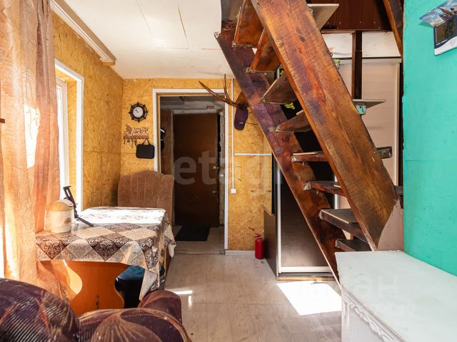 1-й этаж домика поделен на три зоны: кухня, каминный зал, зона отдыха. В зоне отдыха, которая отделена от каминного зала гобеленовыми шторами, стоит раскладной диван-книжка со снимающейся обшивкой, в данный момент она получена их химчистки, так что диван практически новый. Ещё в зоне отдыха расположен трельяж. Кроме камина в доме есть печь (в кухонной зоне), кирпичная труба проходит через второй этаж, обогревая и его. На кухне стоит тумбовый стол и небольшой холодильник. Есть вся посуда. 2-й этаж состоит из маленькой уютной комнатки с тумбочкой, деревянной 1-спальной кроватью и большой террасы - палубы. Палуба тоже отремонтирована и перекрыта лиственницей.