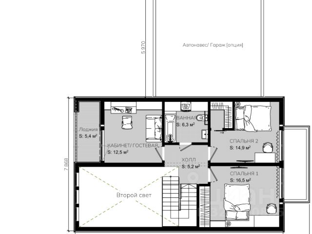 2 этаж: рабочий кабинет, спальня для родителей с гардеробной и зоной туалетного столика, детская комната для мальчика, детская комната для девочки, зимний сад, санузел, ванная комната с санузлом.