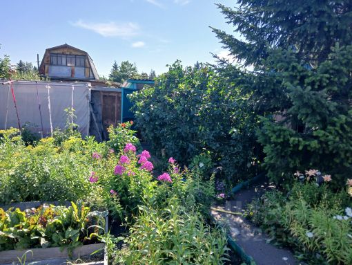 На участке разбит сад с плодовыми и ягодными деревья (яблони, груши, вишня, виноград, ирга, жимолость, рябина, калина, барбарис, смородина, малина, крыжовник).
