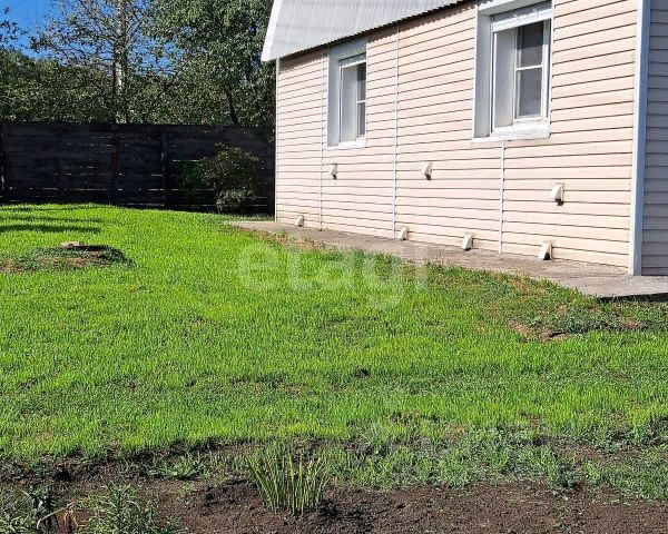Территория участка огорожена высоким деревянным забором.