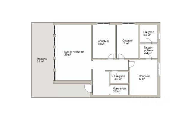 Коттедж состоит из кухни-гостиной - 26 кв.м, 3 (трёх) спален - 16, 14 и 11,5 кв.м., и вспомогательных помещений: холла, коридора, санузла и второго малого санузла, включающего в себя котельную. Высота от пола до потолка 3 метра. Все материалы и комплектующие в доме высокого заводского качества!