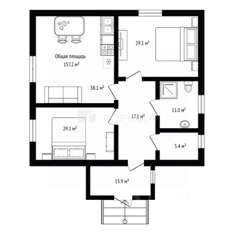 1 этаж: прихожая, холл, кухня гостиная с камином с выходом на террасу, санузел, постирочная с душевой, комната для гостей, переход в банный комплекс.