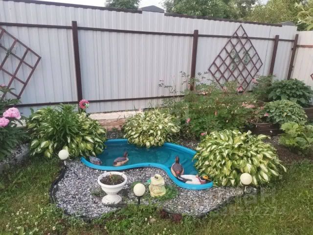 Имеется плодоносящий сад с яблонями, ягодными кустами, теплица на два отсека и декоративный пруд с хвойными и многолетними насаждениями.