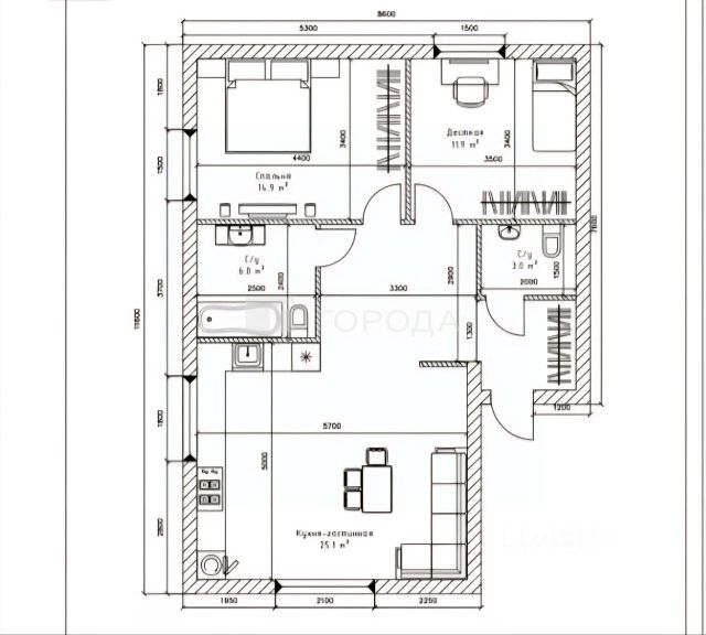 - Стены изнутри оштукатурены под чистовую отделку, на полу ламинат. Высота потолков 3 м.