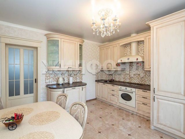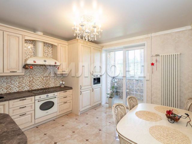 Просторная кухня-гостинная с витражным окном, выходом на большой застекленный балкон, со встроенной техникой производства Италия SМЕG: автоматическая кофемашина, холодильник, дополнительная морозильная камера, индукционная варочная панель с функцией объединения комфорок, мощная вытяжка 90 см, духовой шкаф с таймером и аэрогрилем, полноразмерная посудомоечная машина. Круглая мойка, смеситель, фильтр производства Япония ОМОIКIRI. Большой стол из дерева с раскладным механизмом.