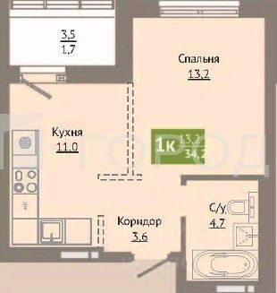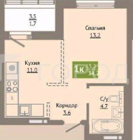 Квартира на 11-м этаже 13-этажного дома, построенного в 2025 году. Общая площадь — 34,2 кв. м, из которых 13,2 кв. м — жилая площадь, 11 кв. м — кухня, + застекленный балкон с РЕМОНТОМ! Высота потолков — 2,7 м.