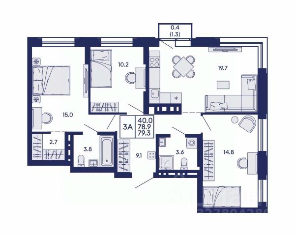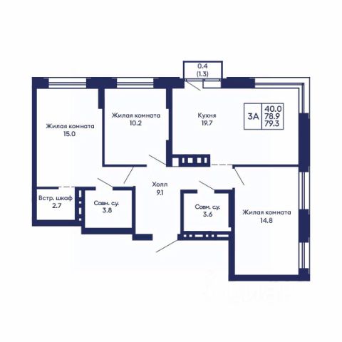 В продаже трехкомнатная квартира общей площадью 60.8 кв. м. без учета большой лоджии.
