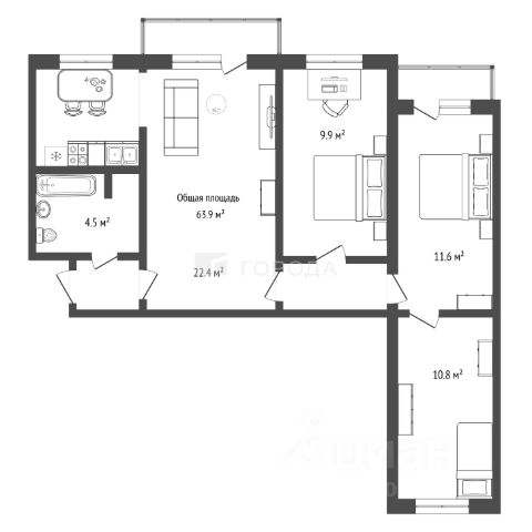 Квартира с кухней-гостиной и тремя спальнями в квартале "Лебедевский". Особенности планировки: балкон, гардеробная, мастер-спальня, окна на две стороны, постирочная, предчистовая отделка, разнесённые спальни.