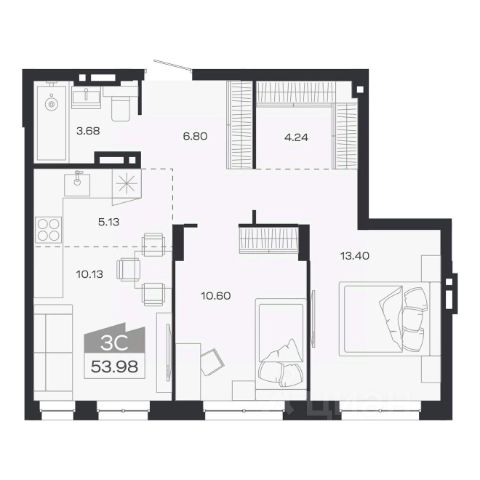 2 изолированные зоны — просторная студийная гостиная с кухонной зоной и отдельная спальня.