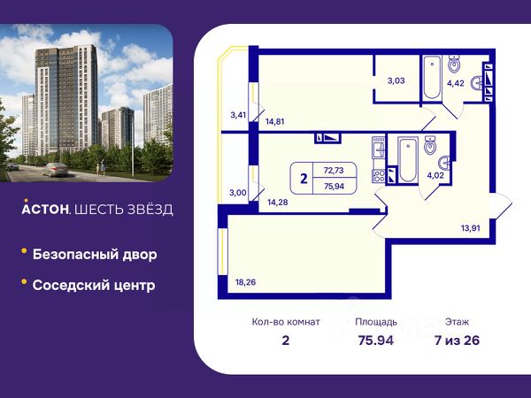 Продается 2-комн. квартира от застройщика с предчистовой отделкой в ЖК "Астон. Шесть Звезд" на 7 этаже. Общая площадь: 75.94 кв.м., жилая: 33.07 кв.м., площадь просторной кухни-столовой: 14.28 кв.м. Комнаты изолированные, все окна выходят на одну сторону. В квартире две лоджии, два совмещенных санузла. Высота потолков 2.65 м. Квартира находится в корпусе 2Б. Дом монолитный, одноподъездный, высотой 26 этажей. На этаже 7 квартир. В подъезде 5 грузовых лифтов. Окончание строительства - 4 квартал 2026 года. Оформление сделки по договору долевого участия. "Астон.Шесть звезд" - современный комплекс из 26-этажных домов класса "комфорт плюс" с уютными квартирами, вдохновляющими видами на левобережье, продуманной организацией жилого пространства, стильным дизайном общественных интерьеров и авторским благоустройством. Природа рядом, для этого ненужно ехать далеко загород. В районе жилого комплекса расположен парк Бугринская роща, в котором есть масса развлечений для вас и вашей семьи: - парк аттракционов - кемпинг "Бугринская гавань" с зонами барбекю - зимний каток и зона для катания на снегоходах - лыжная база "Сибирь" - летом благоустроенный пляж В 10 минутах ходьбы находится большой футбольный стадион, также поблизости есть конный клуб "Мустанг". В пределах 15 минут езды на общественном транспорте расположены учебные заведения - Новосибирский Государственный Технический Университет, Сибирский университет потребительской кооперации и колледжи. Фасады жилого комплекса - воплощение современного стиля. Такой эффект дает сочетание строгих линий, благородных оттенков натуральных материалов и блеска вертикального витражного остекления. Авторский дизайн холлов сочетает натуральные оттенки и фактуры дерева, керамогранита, декоративной штукатурки. Обилие света и воздуха создает сочетание стеклянных и зеркальных элементов со стильной трековой подсветкой, дополненной акцентнвми бра. Мягкие зоны в таком антураже особенно уютны и удобны для коротких встреч или ожидания курьера. Квартира будет просторнее, если оставить коляску, велосипед или игровой инвентарь в колясочной с удобными полками. Хранить не сезонные вещи можно в личной кладовой. Благоустроенный закрытый двор спроектирован с учетом безопасности и многофункциональности пространства - здесь можно поиграть с детьми, заняться спортом или просто отдохнуть в парковой зоне. Центром притяжения в "Астон.Шесть звезд" станет современный и функциональный комьюнити-центр. Это не просто модное слово, а забота о комфорте и хорошем настроении жителей комплекса. Здесь можно спокойно поработать утро, встретиться с соседями за чашкой чая или провести небольшое мероприятие. #z6DgoB Купить квартиру в жилмассиве Северо-Чемской в городе Новосибирск.