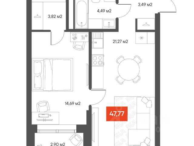 В комнатах установлена вся необходимая мебель и техника, что обеспечит комфортное проживание с первых дней. Планировка квартиры продумана до мелочей, а отдельный санузел добавляет удобства для все семьи.