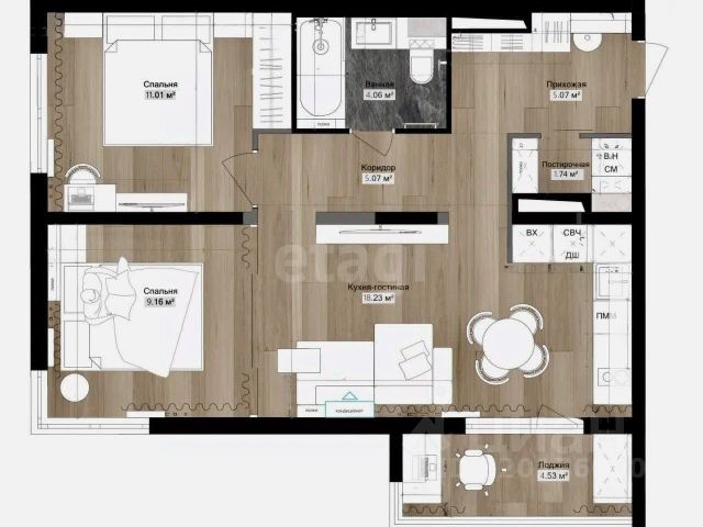 + В спальне два окна, есть возможность одну комнату зонировать на две;
