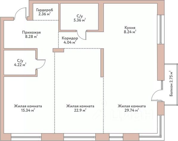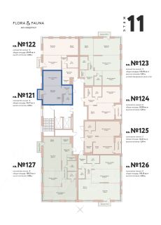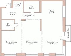 В пенхаусе выделены общественная и приватная зоны. На среднем этаже расположены: большая (40 м2) гостиная с высоким (5.5 м) потолком и панорамными окнами в потолок с выходом на террасу (13 м2), мастер-спальня, блок из трех комнат с высотой потолка до 5.5 м и большими окнами, санузлов, гардеробных, кладовой, вторым входом в квартиру. Этажом ниже: большая (36 м2) кухня-гостиная с выходом на лоджию, санузел с сауной, большой ванной, душем, инсталляций, кладовых. На верхнем этаже (антресоль) расположен кабинет и комната.