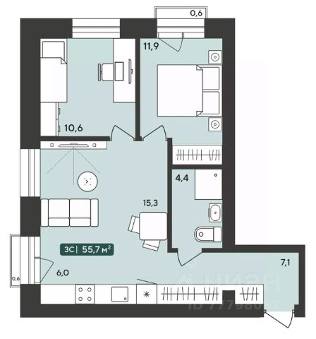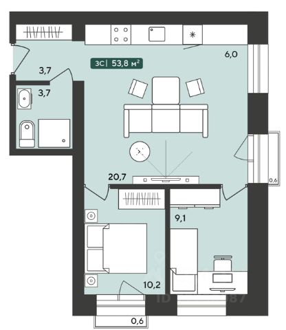 Кухня-гостиная - 24,7 квадратов; 29, 7 кв. м. - комната. Можно разделить на две комнаты, отдельно выделить детскую или ещё одну спальню.