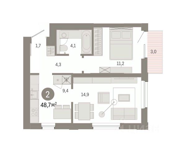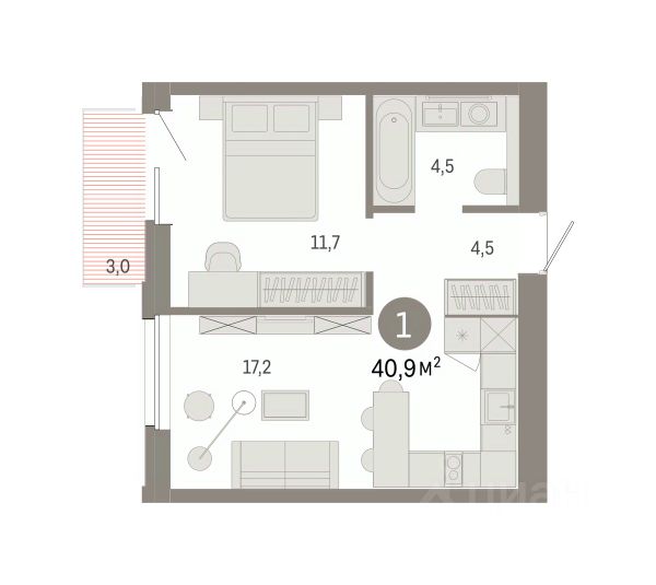 Квартира с кухней-гостиной и двумя спальнями в проекте Город-на-озере. Особенности планировки: балкон, второй санузел, потолки 3 м и выше, предчистовая отделка, разнесённые спальни.