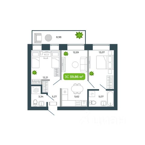 Продаётся студия в строящемся доме (Дом 11), срок сдачи: III-кв. 2026, общей площадью 58.9 кв.м., на 3 этаже. Жилой комплекс "Ботаника" от застройщика "Ботаника Девелопмент" расположен в южной части р.п. Кольцово по ул. Кольцевая.